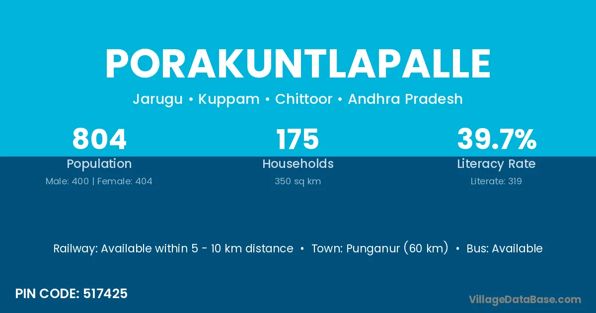 Punganur (60 km) is the nearest town to Porakuntlapalle village for major economic activities and is located approximately 60 km away.