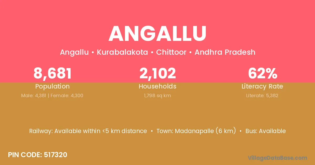 Madanapalle (6 km) is the nearest town to Angallu village for major economic activities and is located approximately 6 km away.