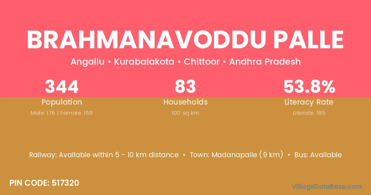 Brahmanavoddu Palle village has a total population of 344 people, of which 176 are males and 168 are females.