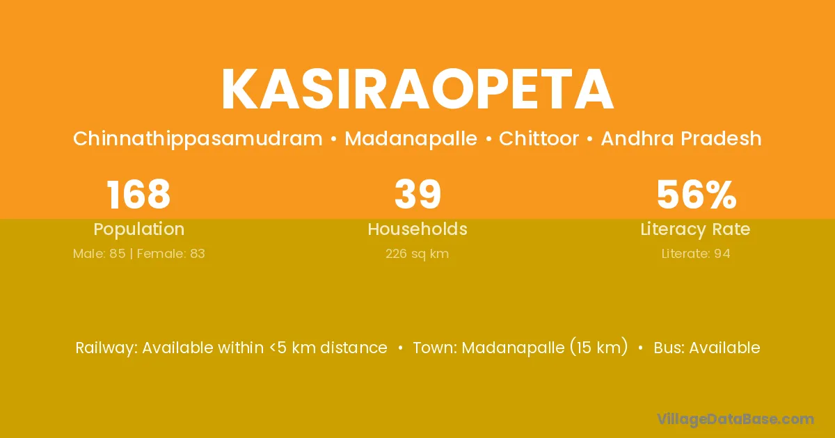 Kasiraopeta village has a total population of 168 people, of which 85 are males and 83 are females.