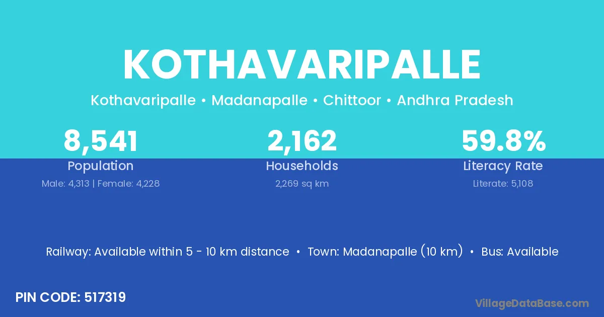 Kothavaripalle village has a total population of 8,541 people, of which 4,313 are males and 4,228 are females.
