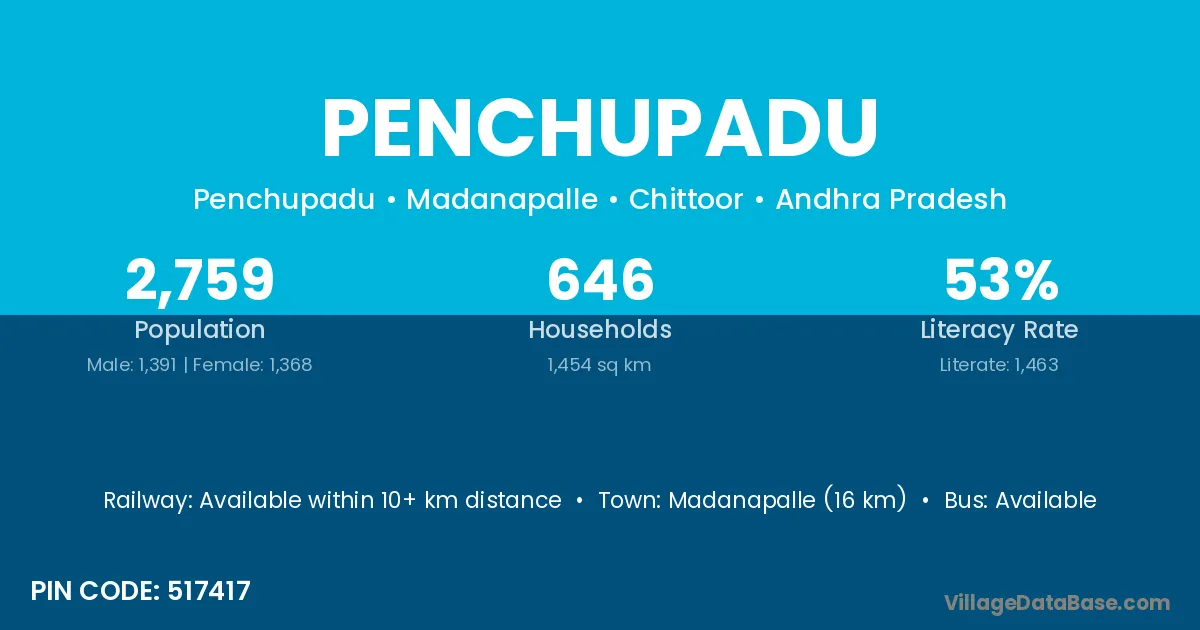 Madanapalle (16 km) is the nearest town to Penchupadu village for major economic activities and is located approximately 16 km away.