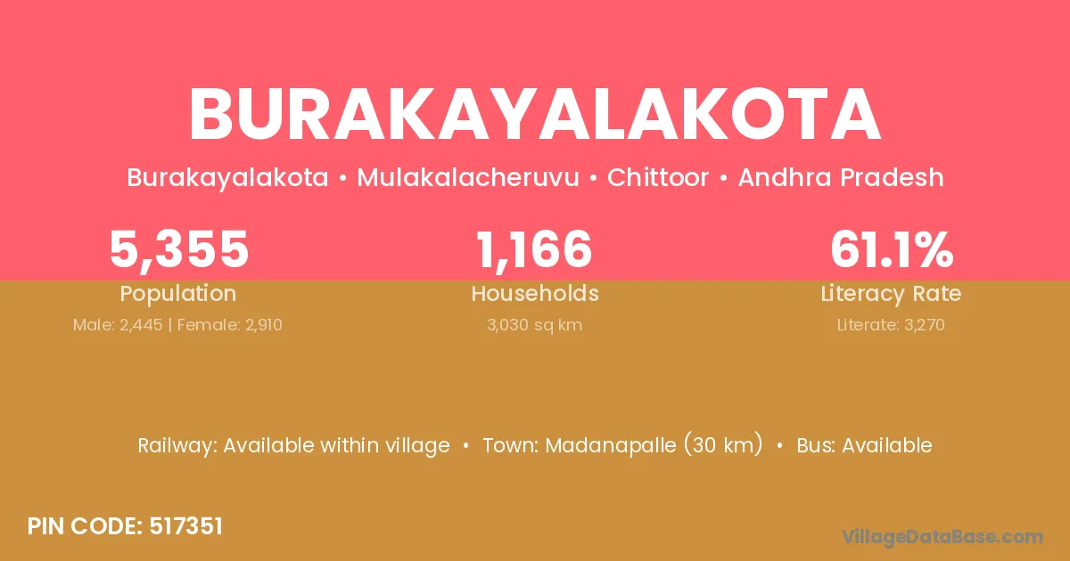 Madanapalle (30 km) is the nearest town to Burakayalakota village for major economic activities and is located approximately 30 km away.