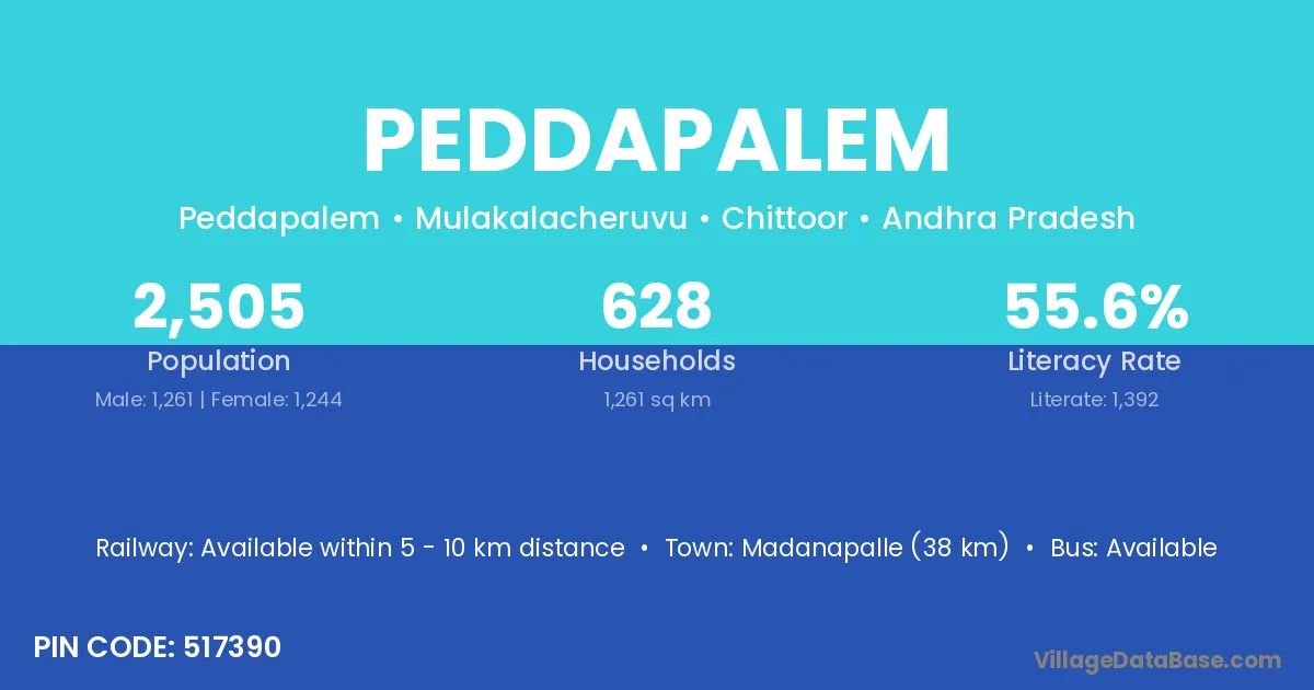 Madanapalle (38 km) is the nearest town to Peddapalem village for major economic activities and is located approximately 38 km away.
