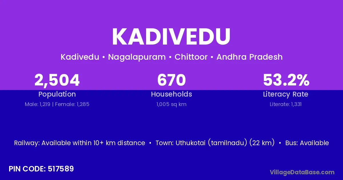 Uthukotai (tamilnadu) (22 km) is the nearest town to Kadivedu village for major economic activities and is located approximately 22 km away.