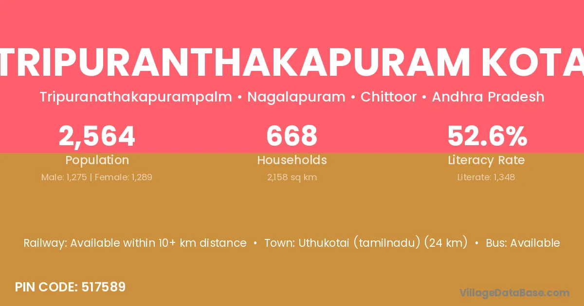 Tripuranthakapuram Kota village has a total population of 2,564 people, of which 1,275 are males and 1,289 are females.