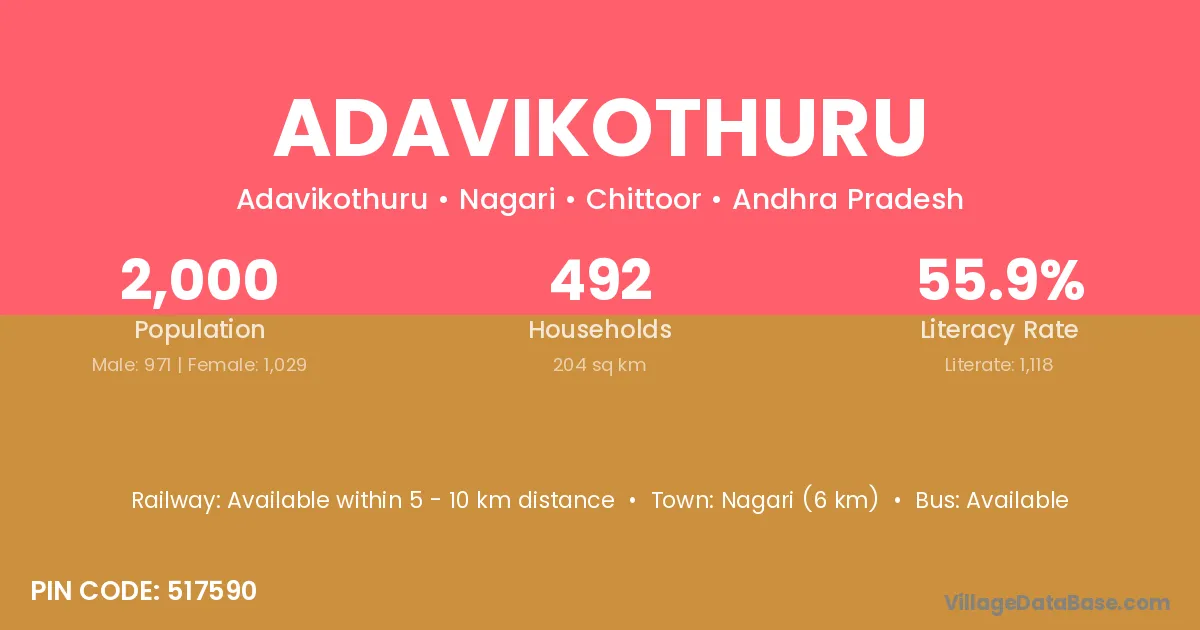 Nagari (6 km) is the nearest town to Adavikothuru village for major economic activities and is located approximately 6 km away.