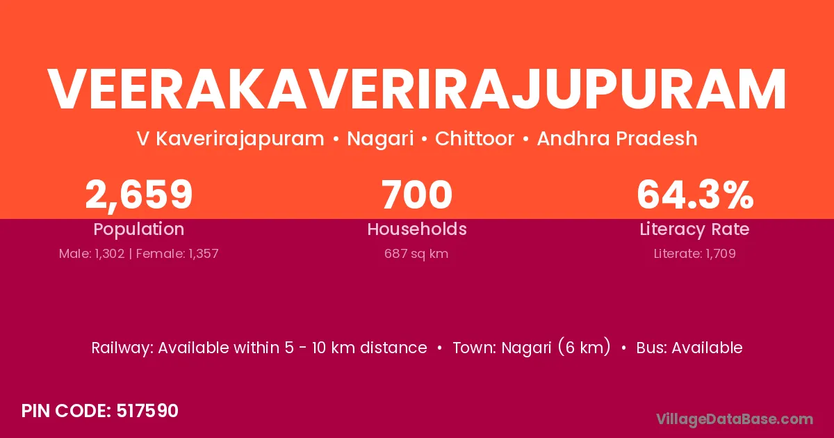 Nagari (6 km) is the nearest town to Veerakaverirajupuram village for major economic activities and is located approximately 6 km away.