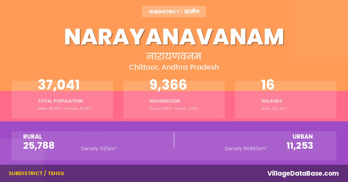 According to the 2011 census The total area of Narayanavanam Mandal is 230 km², with a population of 37041 people. The population density is 161 inhabitants per square kilometre, and there are approximately 9366 houses in the sub district.