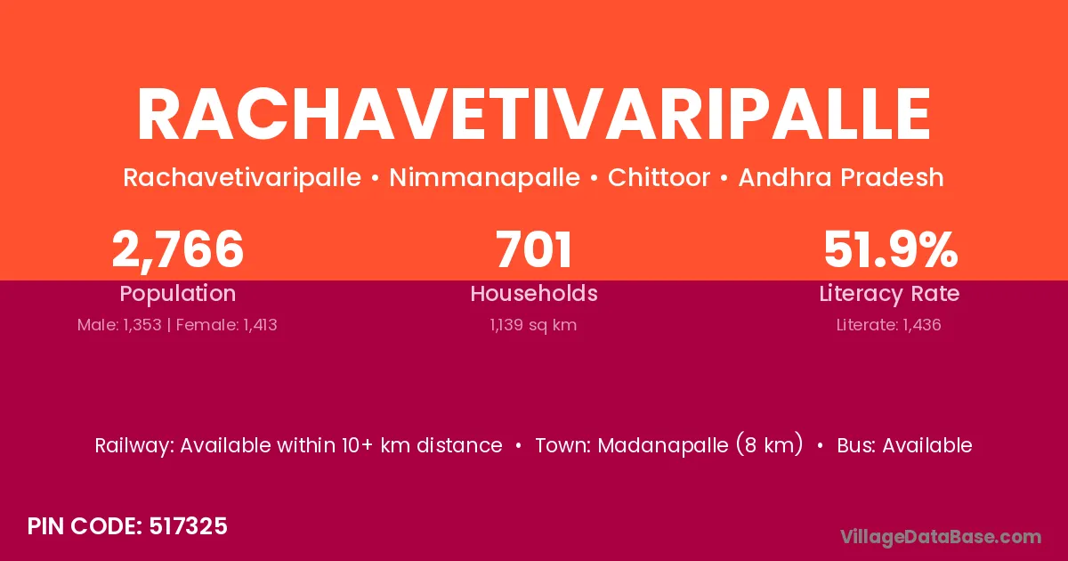 Madanapalle (8 km) is the nearest town to Rachavetivaripalle village for major economic activities and is located approximately 8 km away.