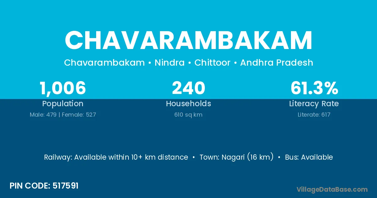 Nagari (16 km) is the nearest town to Chavarambakam village for major economic activities and is located approximately 16 km away.