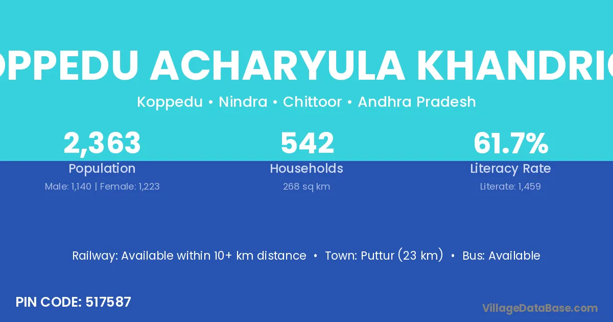Koppedu Acharyula Khandriga village has a total population of 2,363 people, of which 1,140 are males and 1,223 are females.