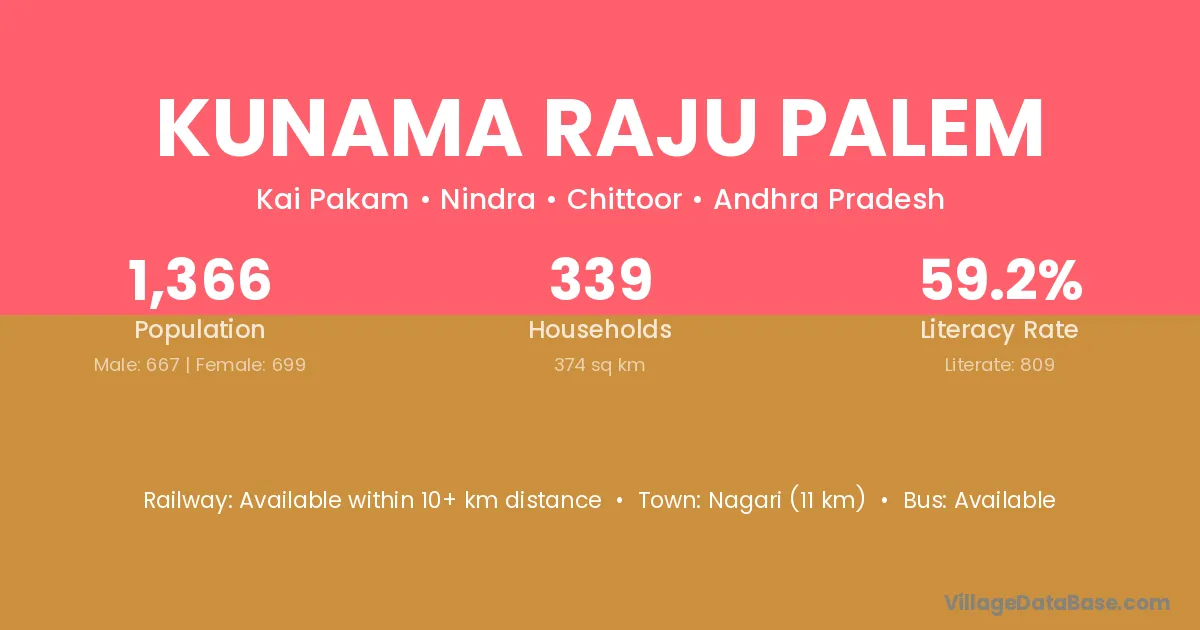 Nagari (11 km) is the nearest town to Kunama Raju Palem village for major economic activities and is located approximately 11 km away.