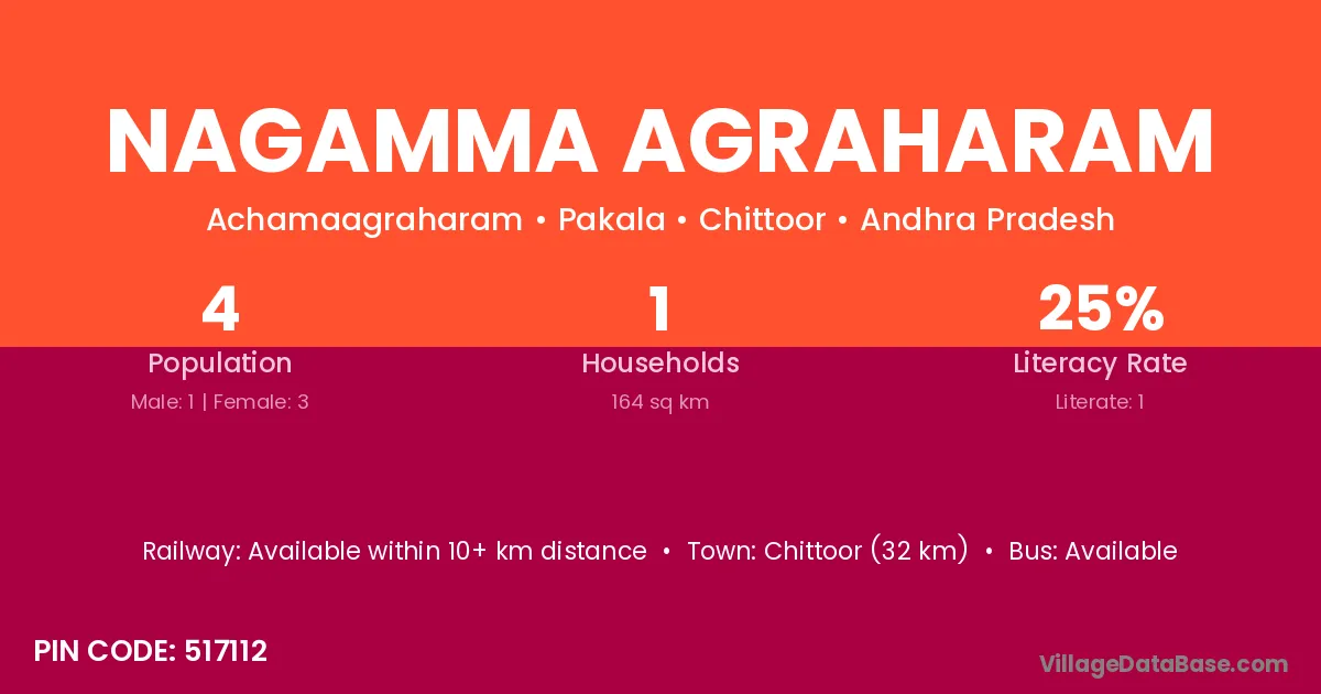 Chittoor (32 km) is the nearest town to Nagamma Agraharam village for major economic activities and is located approximately 32 km away.
