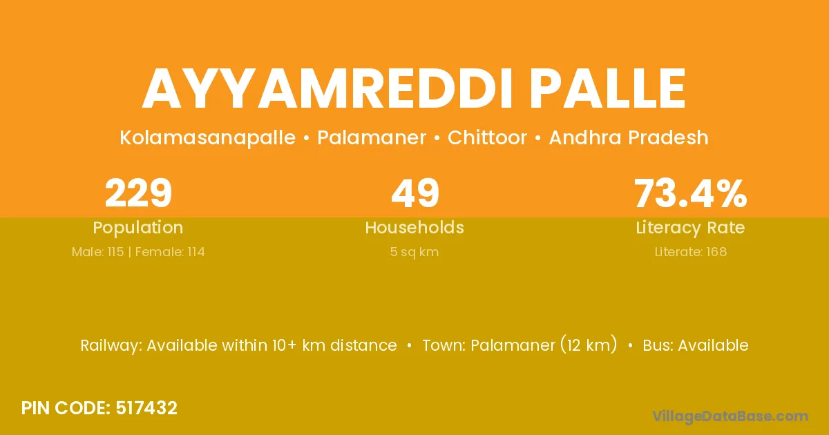 Ayyamreddi Palle village has a total population of 229 people, of which 115 are males and 114 are females.