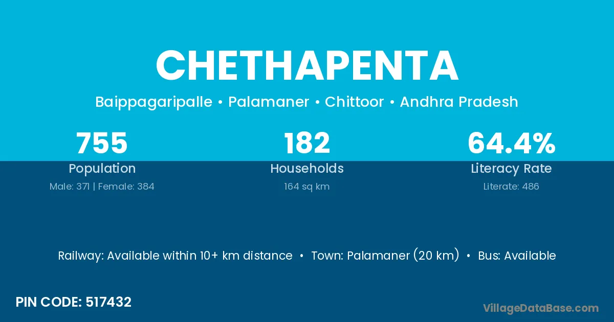 Palamaner (20 km) is the nearest town to Chethapenta village for major economic activities and is located approximately 20 km away.