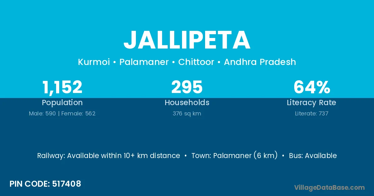Palamaner (6 km) is the nearest town to Jallipeta village for major economic activities and is located approximately 6 km away.