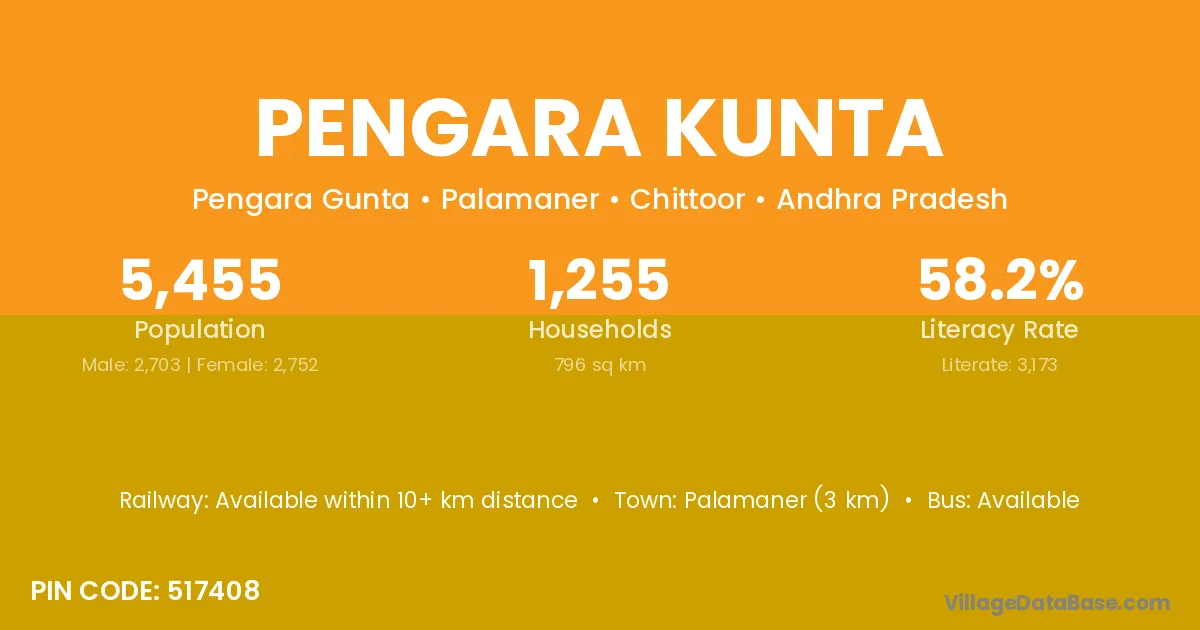 Palamaner (3 km) is the nearest town to Pengara Kunta village for major economic activities and is located approximately 3 km away.