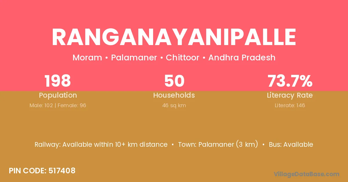 Ranganayanipalle village has a total population of 198 people, of which 102 are males and 96 are females.