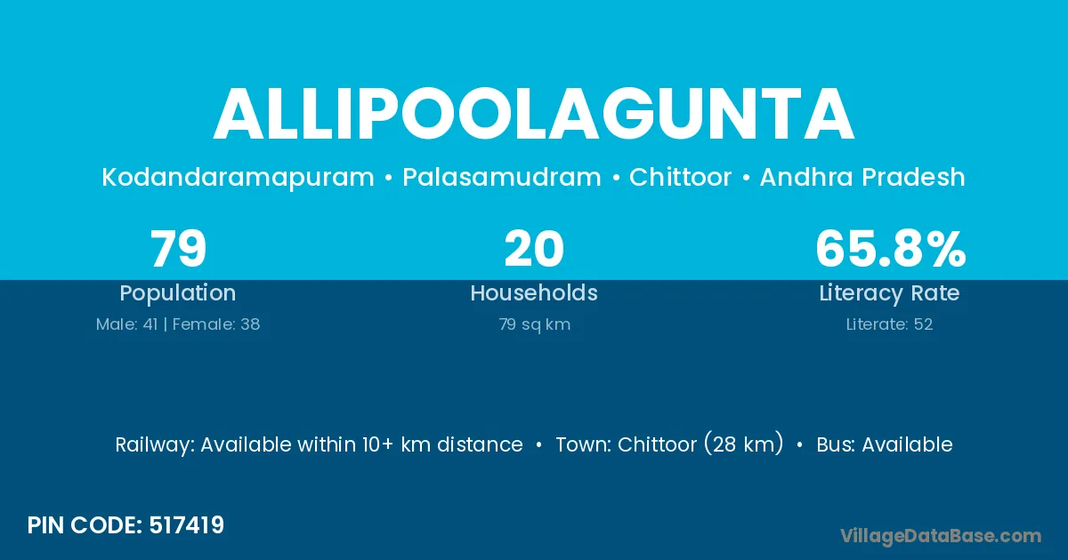 Allipoolagunta village has a total population of 79 people, of which 41 are males and 38 are females.