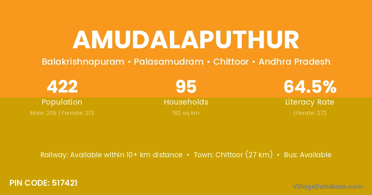 Chittoor (27 km) is the nearest town to Amudalaputhur village for major economic activities and is located approximately 27 km away.