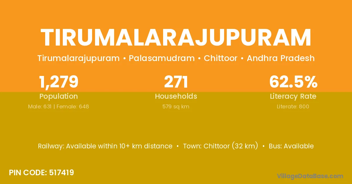 Tirumalarajupuram village has a total population of 1,279 people, of which 631 are males and 648 are females.