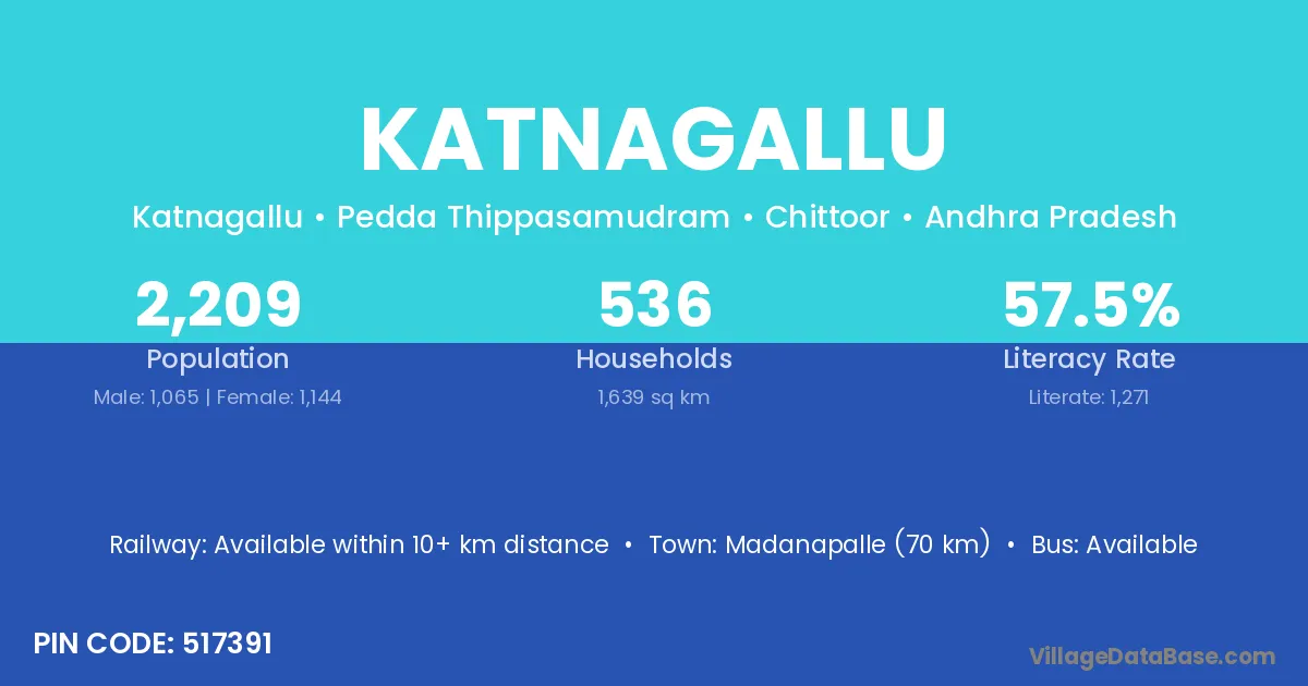 Madanapalle (70 km) is the nearest town to Katnagallu village for major economic activities and is located approximately 70 km away.
