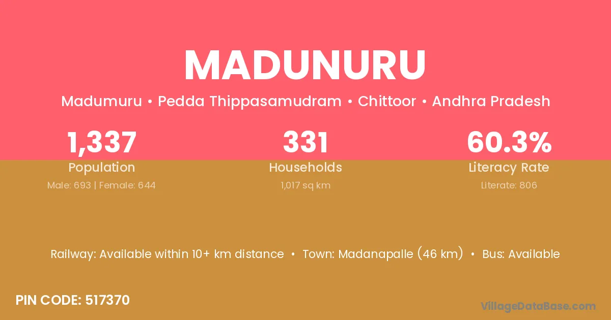 Madanapalle (46 km) is the nearest town to Madunuru village for major economic activities and is located approximately 46 km away.