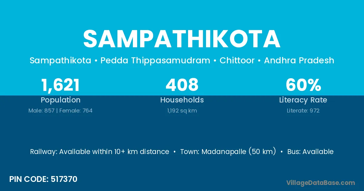 Madanapalle (50 km) is the nearest town to Sampathikota village for major economic activities and is located approximately 50 km away.
