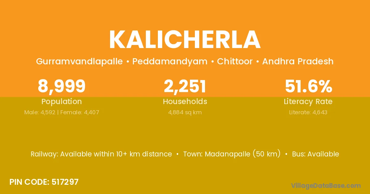 Madanapalle (50 km) is the nearest town to Kalicherla village for major economic activities and is located approximately 50 km away.