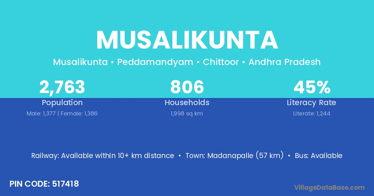 Madanapalle (57 km) is the nearest town to Musalikunta village for major economic activities and is located approximately 57 km away.