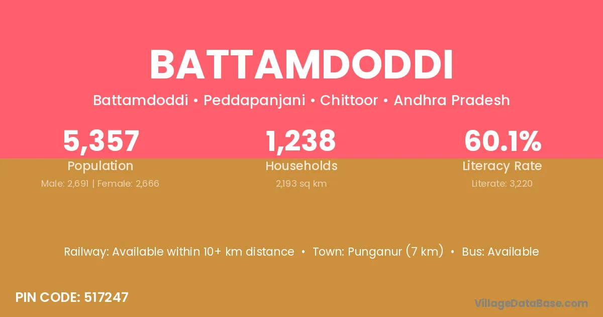 Battamdoddi village has a total population of 5,357 people, of which 2,691 are males and 2,666 are females.