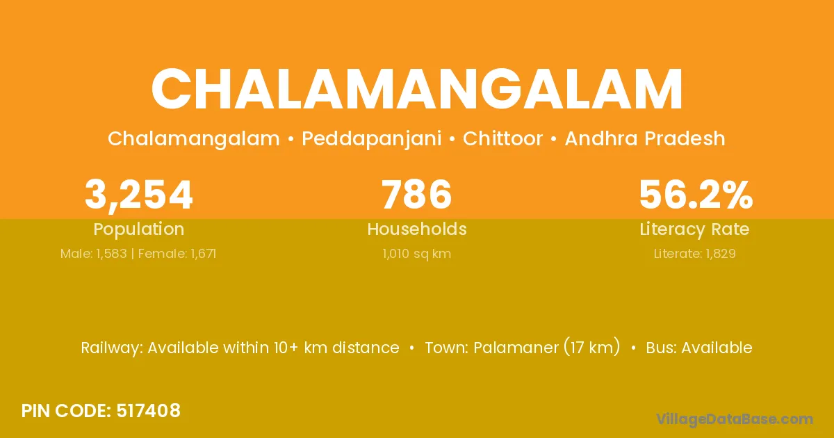 Palamaner (17 km) is the nearest town to Chalamangalam village for major economic activities and is located approximately 17 km away.