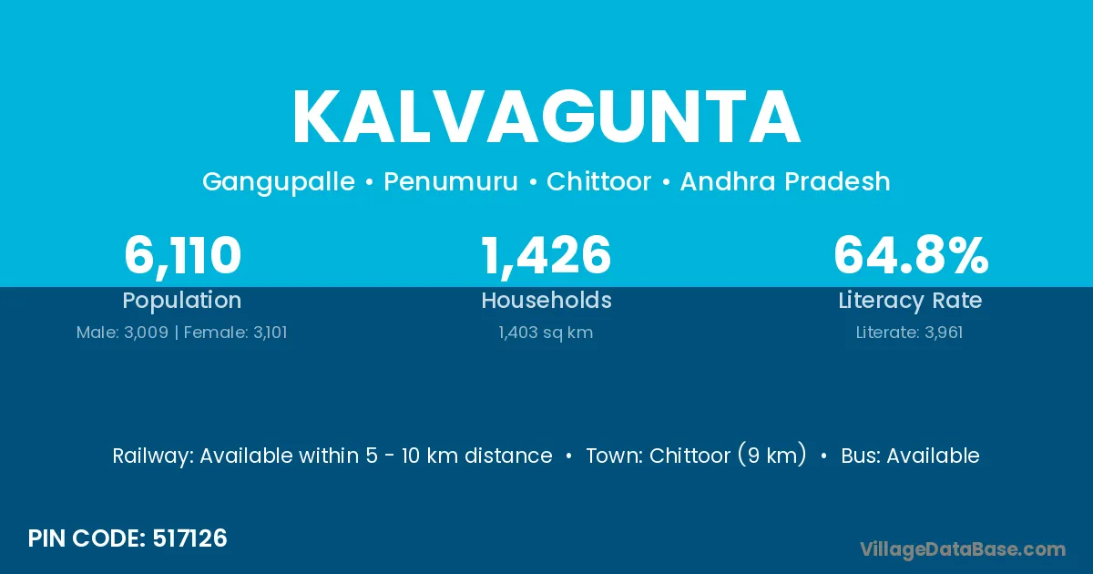 Chittoor (9 km) is the nearest town to Kalvagunta village for major economic activities and is located approximately 9 km away.