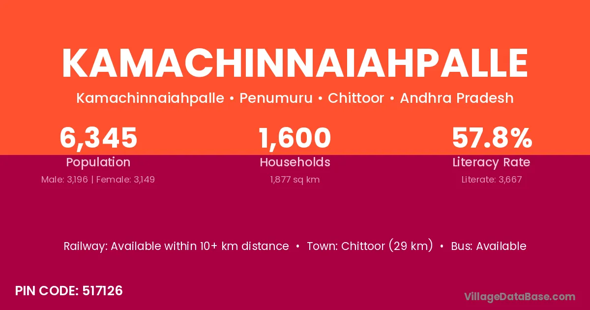 Chittoor (29 km) is the nearest town to Kamachinnaiahpalle village for major economic activities and is located approximately 29 km away.