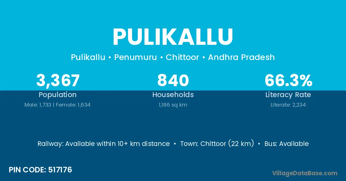 Chittoor (22 km) is the nearest town to Pulikallu village for major economic activities and is located approximately 22 km away.