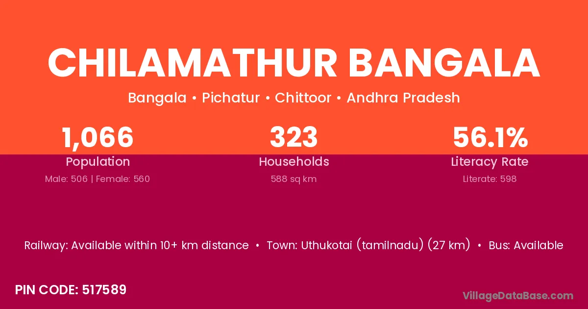 Chilamathur Bangala village has a total population of 1,066 people, of which 506 are males and 560 are females.