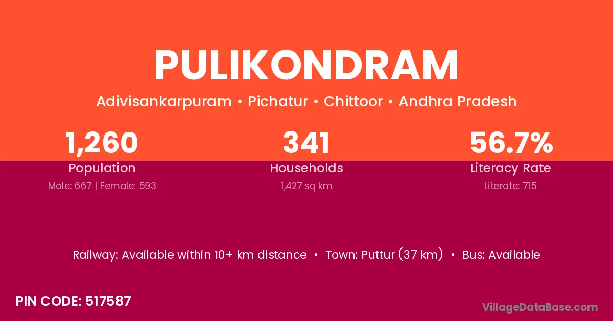 Puttur (37 km) is the nearest town to Pulikondram village for major economic activities and is located approximately 37 km away.