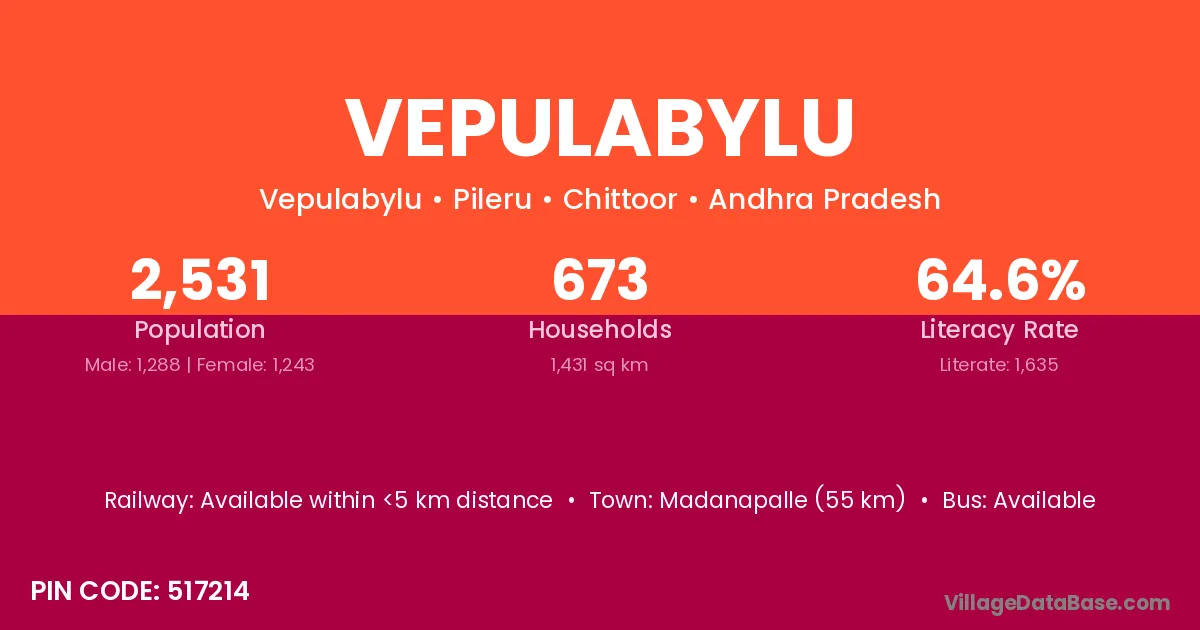 Vepulabylu village has a total population of 2,531 people, of which 1,288 are males and 1,243 are females.