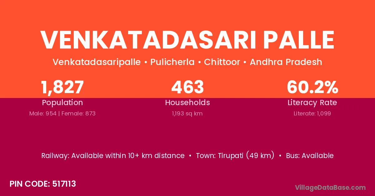 Tirupati (49 km) is the nearest town to Venkatadasari Palle village for major economic activities and is located approximately 49 km away.