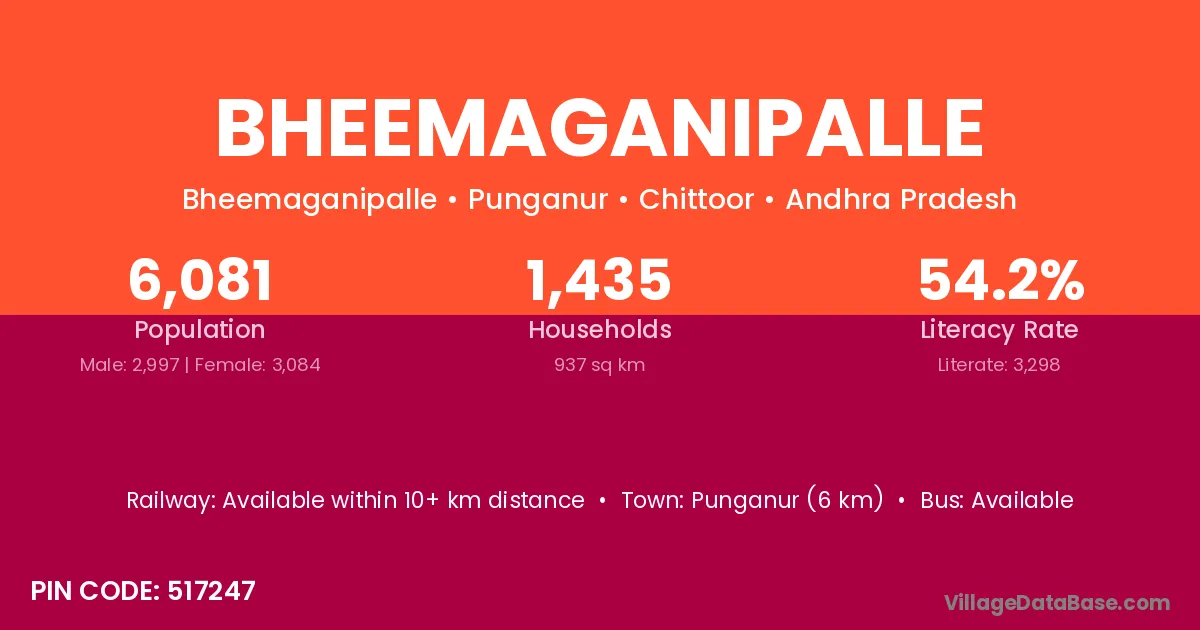 Punganur (6 km) is the nearest town to Bheemaganipalle village for major economic activities and is located approximately 6 km away.
