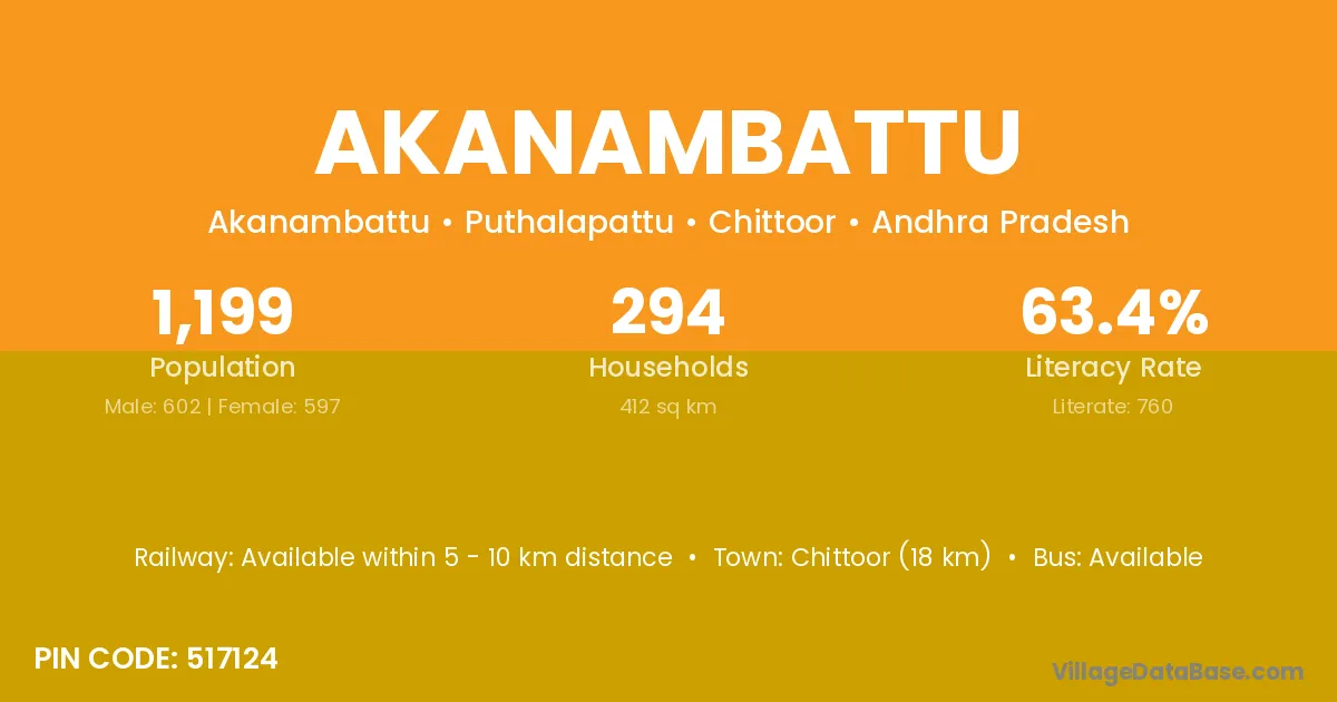 Akanambattu village has a total population of 1,199 people, of which 602 are males and 597 are females.