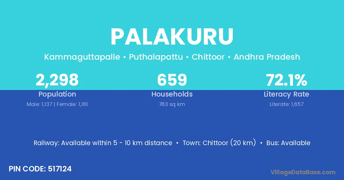 Chittoor (20 km) is the nearest town to Palakuru village for major economic activities and is located approximately 20 km away.