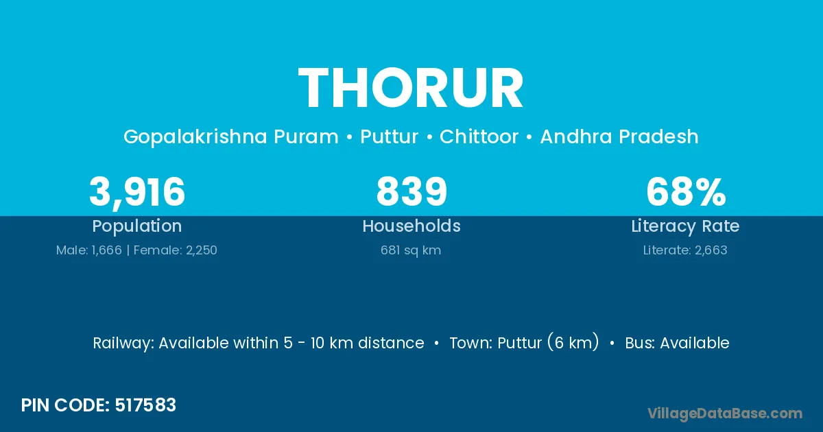 Puttur (6 km) is the nearest town to Thorur village for major economic activities and is located approximately 6 km away.