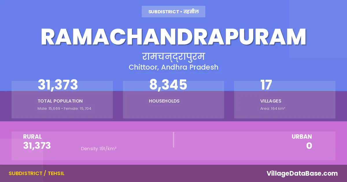 Ramachandrapuram is a town and Mandal in the Chittoor district of the Andhra Pradesh. In India, a Mandal is a subdivision of a district responsible for the administration and revenue collection of a specific area within the district. Mandals play a crucial role in the local governance structure, contributing significantly to the development and administration of their communities.