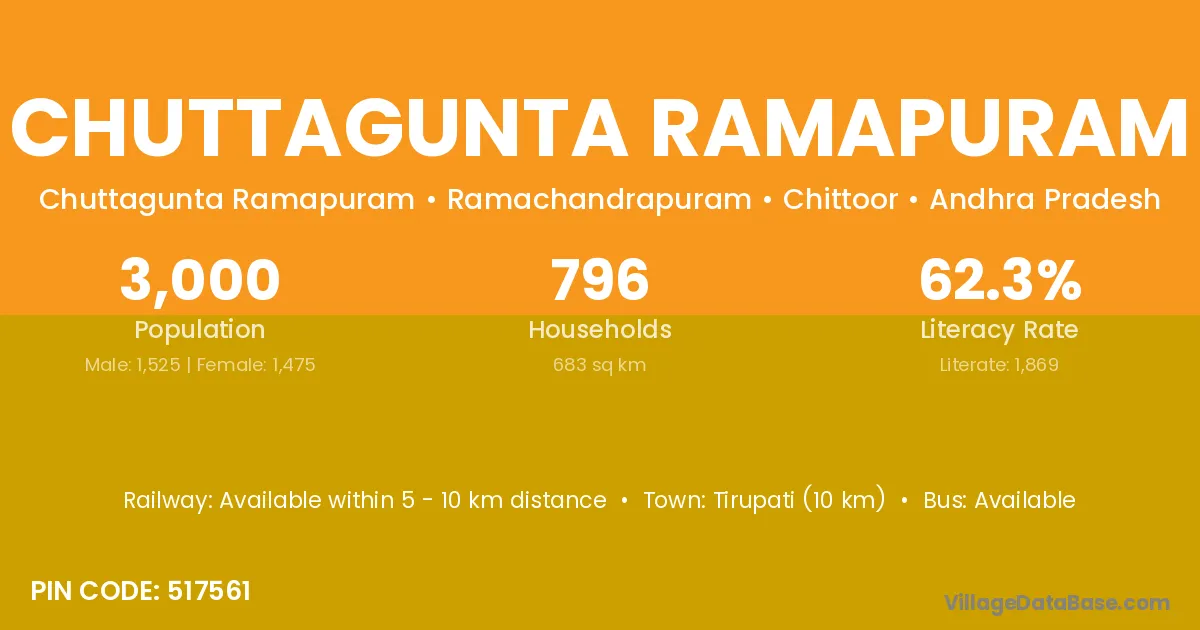 Chuttagunta Ramapuram village has a total population of 3,000 people, of which 1,525 are males and 1,475 are females.