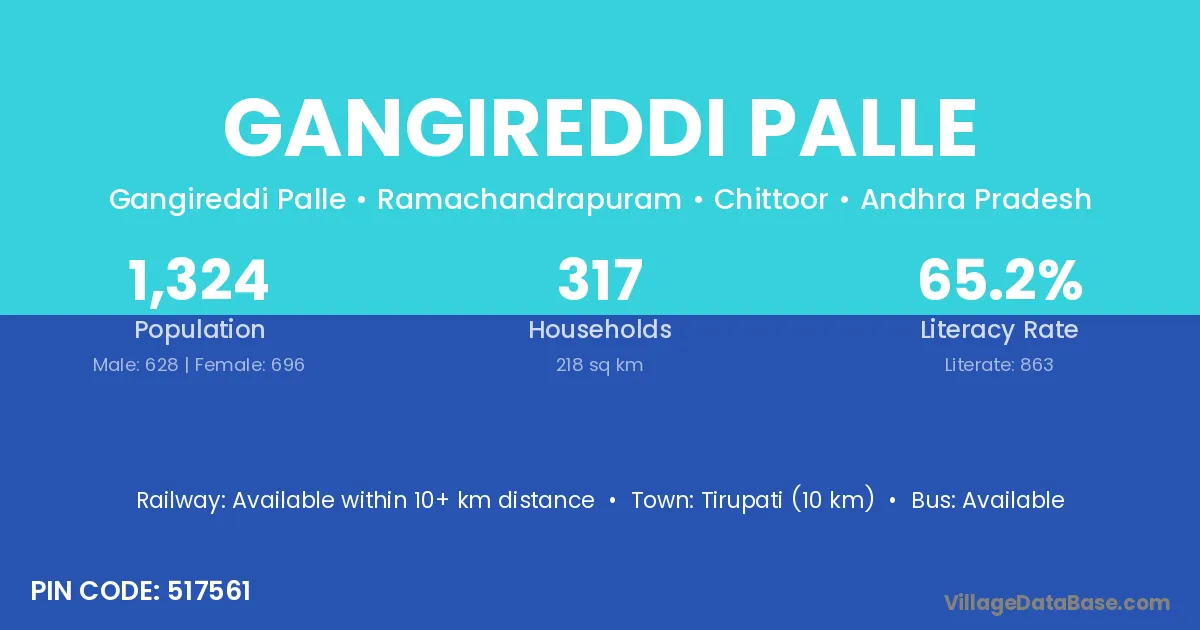 Gangireddi Palle village has a total population of 1,324 people, of which 628 are males and 696 are females.