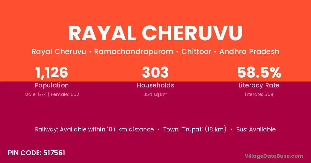 Rayal Cheruvu village has a total population of 1,126 people, of which 574 are males and 552 are females.