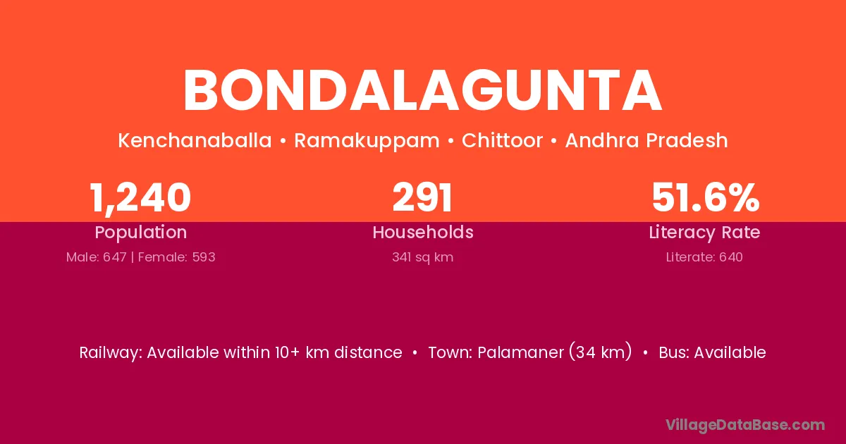 Bondalagunta village has a total population of 1,240 people, of which 647 are males and 593 are females.