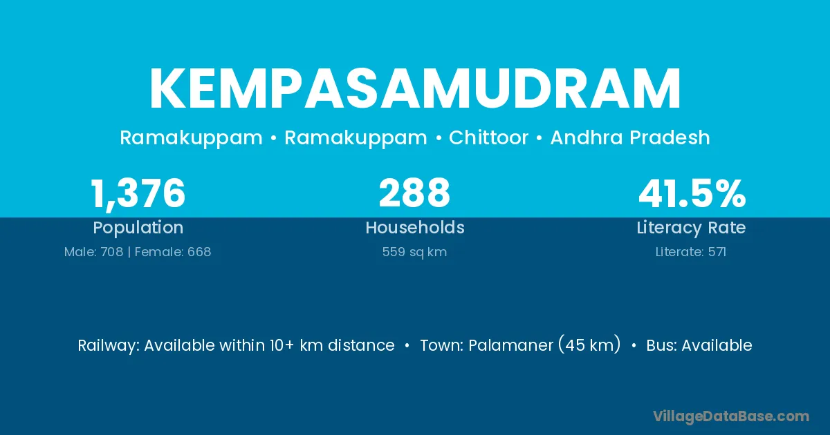 Palamaner (45 km) is the nearest town to Kempasamudram village for major economic activities and is located approximately 45 km away.